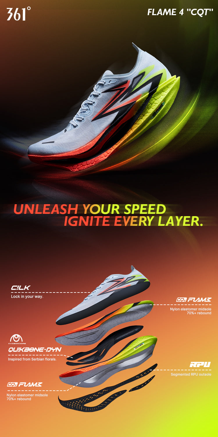 Double-layer Qu!kFLAMECQT (FLAMECQT) midsole for lighter weight, more springiness, and better cushioning, effectively saving energy for long-distance running activities.