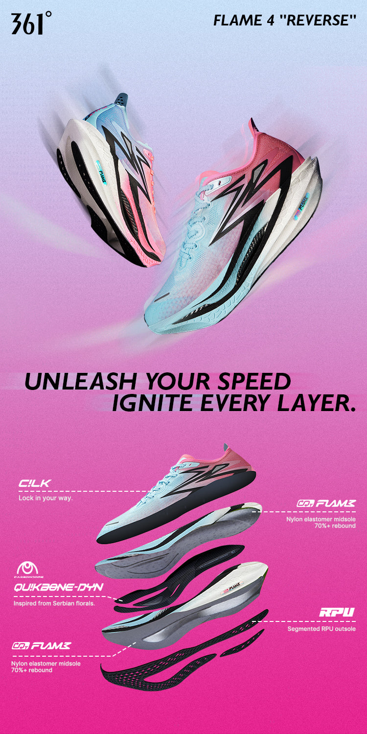 Double-layer Qu!kFLAMECQT (FLAMECQT) midsole for lighter weight, more springiness, and better cushioning, effectively saving energy for long-distance running activities.