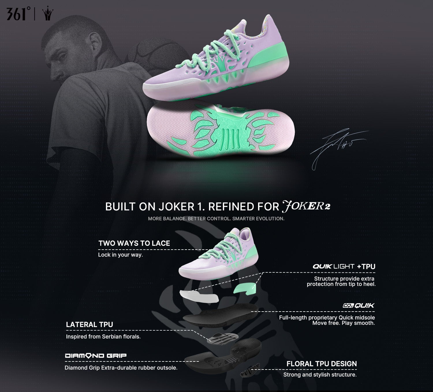 Featuring diamond grip rubber with Serbian-inspired texture for superior traction.Built-in anti-torsion plate prevents arch over-twisting. The side features Serbian-inspired floral TPU, combining style and function to boost lateral support and reduce rollover risk.