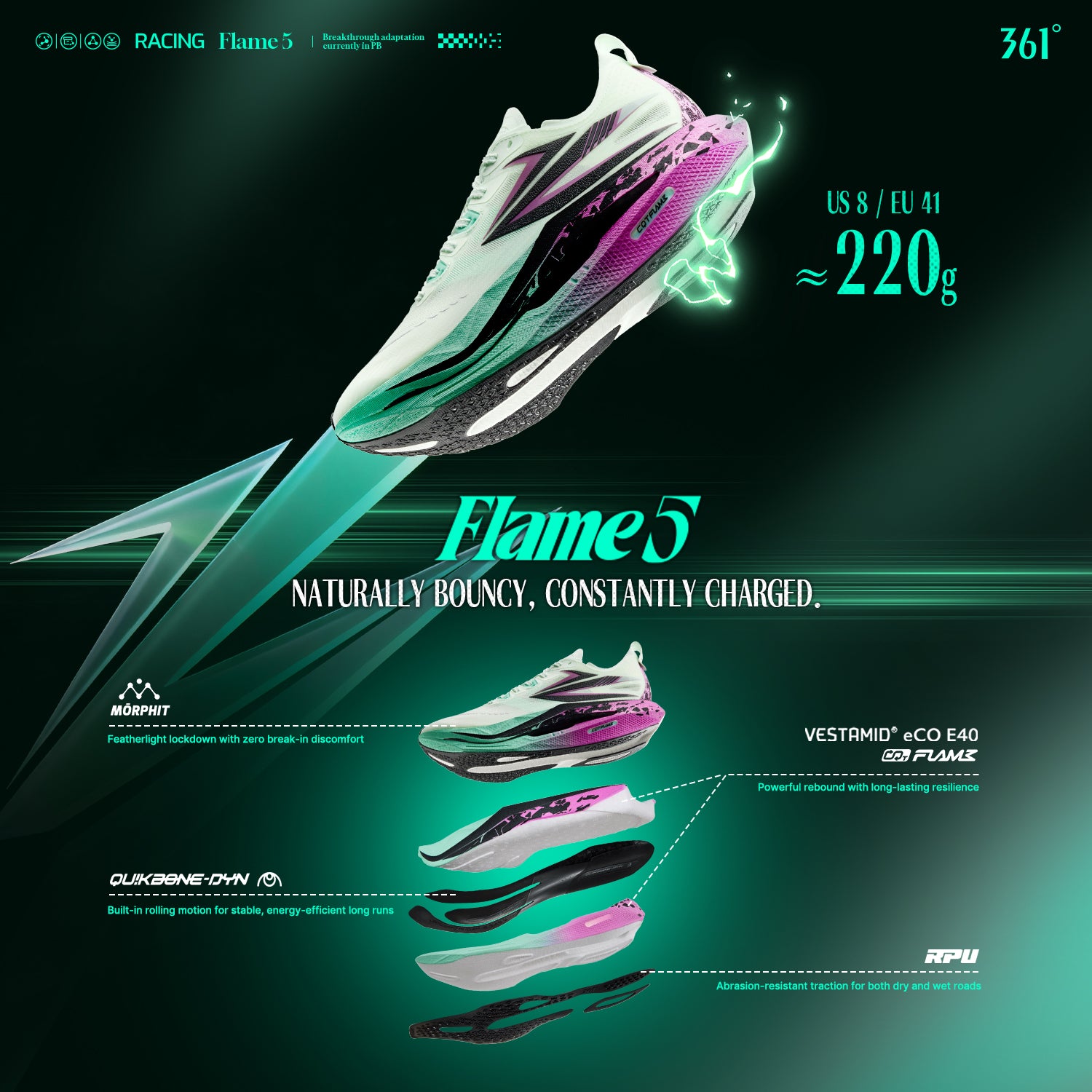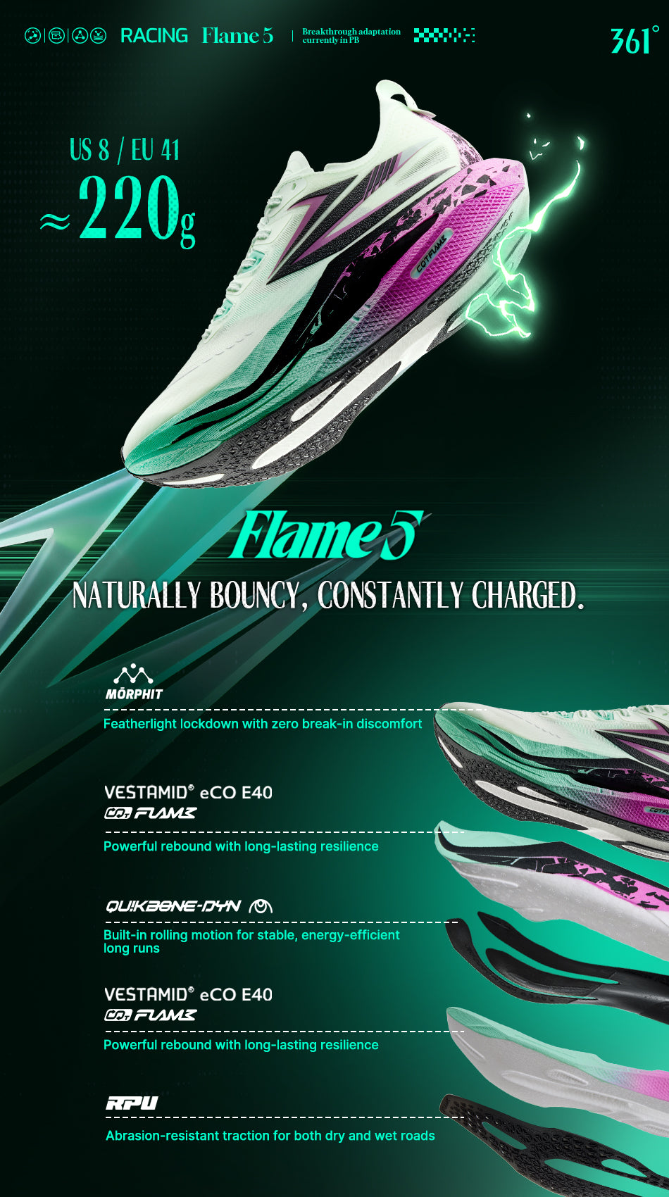 Powered by CQT FLAME and upgraded eCO E40 nylon material, with hardness lowered to 40C, up to 85% energy feedback, and 80% rebound rate—delivering soft comfort, strong responsiveness, and durable performance that resists compression over time.