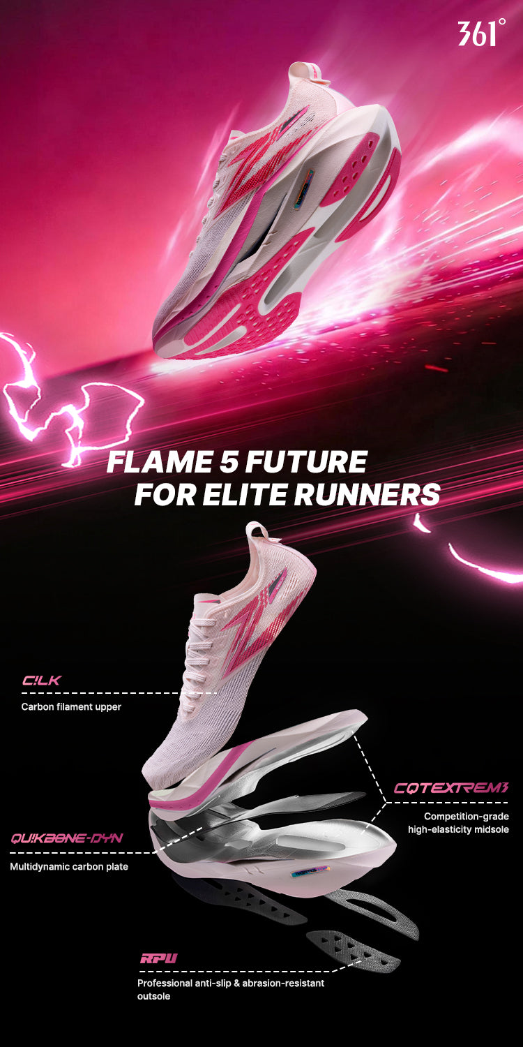Weighing approximately 200g (US 8.5), FLAME 5 FUTURE achieves competitive lightweight performance. Optimized RPU outsole further cuts weight and improves transition efficiency, ensuring speed without sacrificing structure or durability.