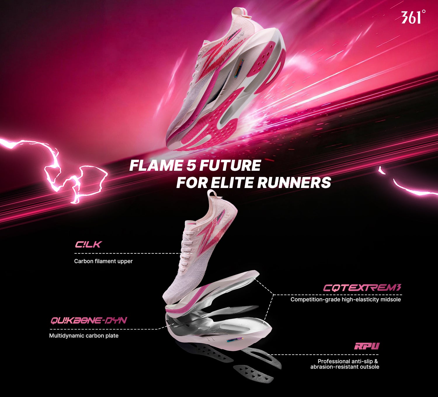 High-rebound CQTEXTREME midsole improves speed efficiency and durability.