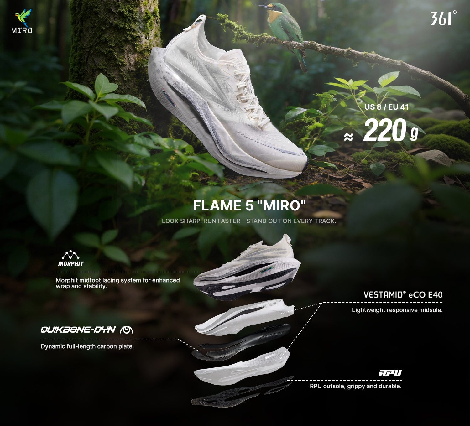 RPU rubber outsole with dense micro-lugs delivers reliable grip on dry and wet surfaces for confident cornering.