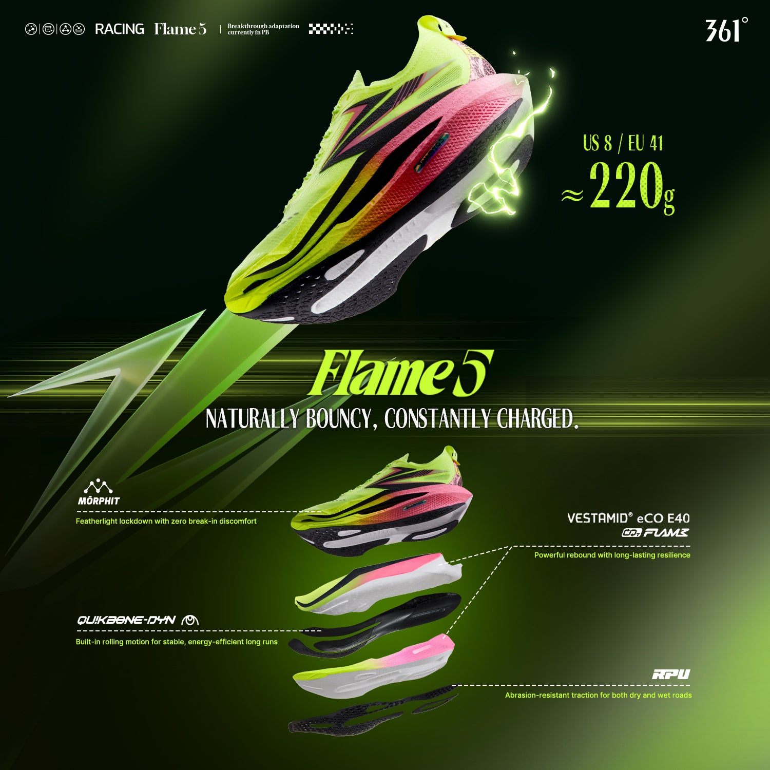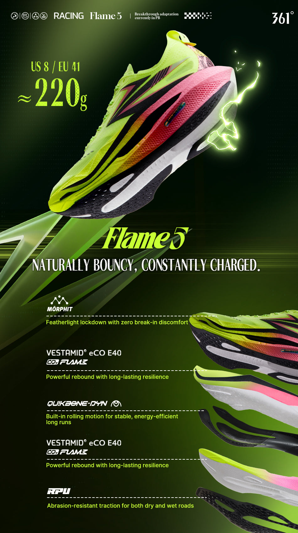 Powered by CQT FLAME and upgraded eCO E40 nylon material, with hardness lowered to 40C, up to 85% energy feedback, and 80% rebound rate—delivering soft comfort, strong responsiveness, and durable performance that resists compression over time.