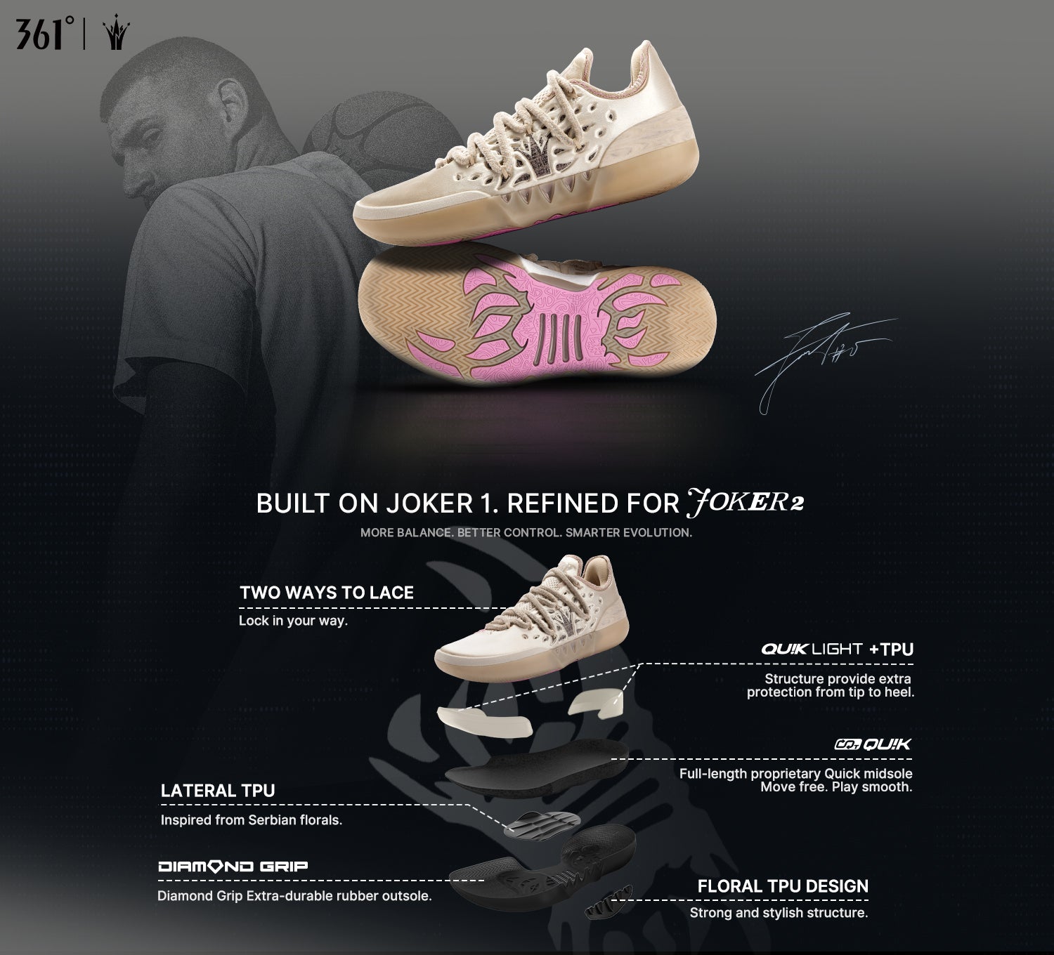 Featuring diamond grip rubber with Serbian-inspired texture for superior traction.Built-in anti-torsion plate prevents arch over-twisting. The side features Serbian-inspired floral TPU, combining style and function to boost lateral support and reduce rollover risk.