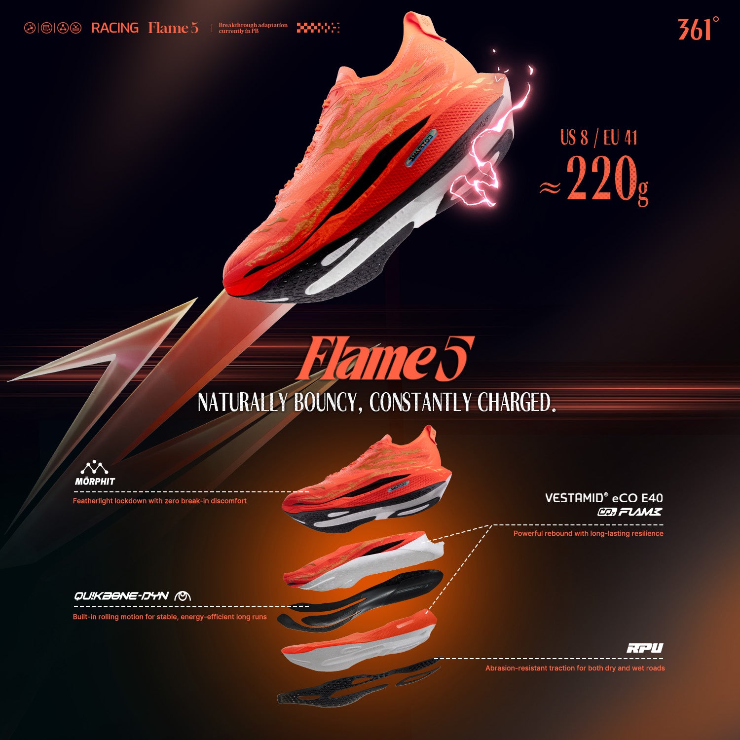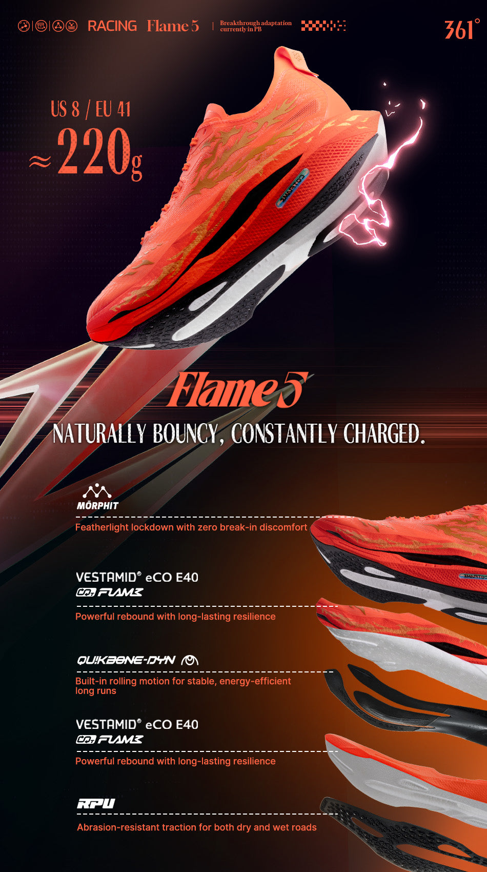 Powered by CQT FLAME and upgraded eCO E40 nylon material, with hardness lowered to 40C, up to 85% energy feedback, and 80% rebound rate—delivering soft comfort, strong responsiveness, and durable performance that resists compression over time.