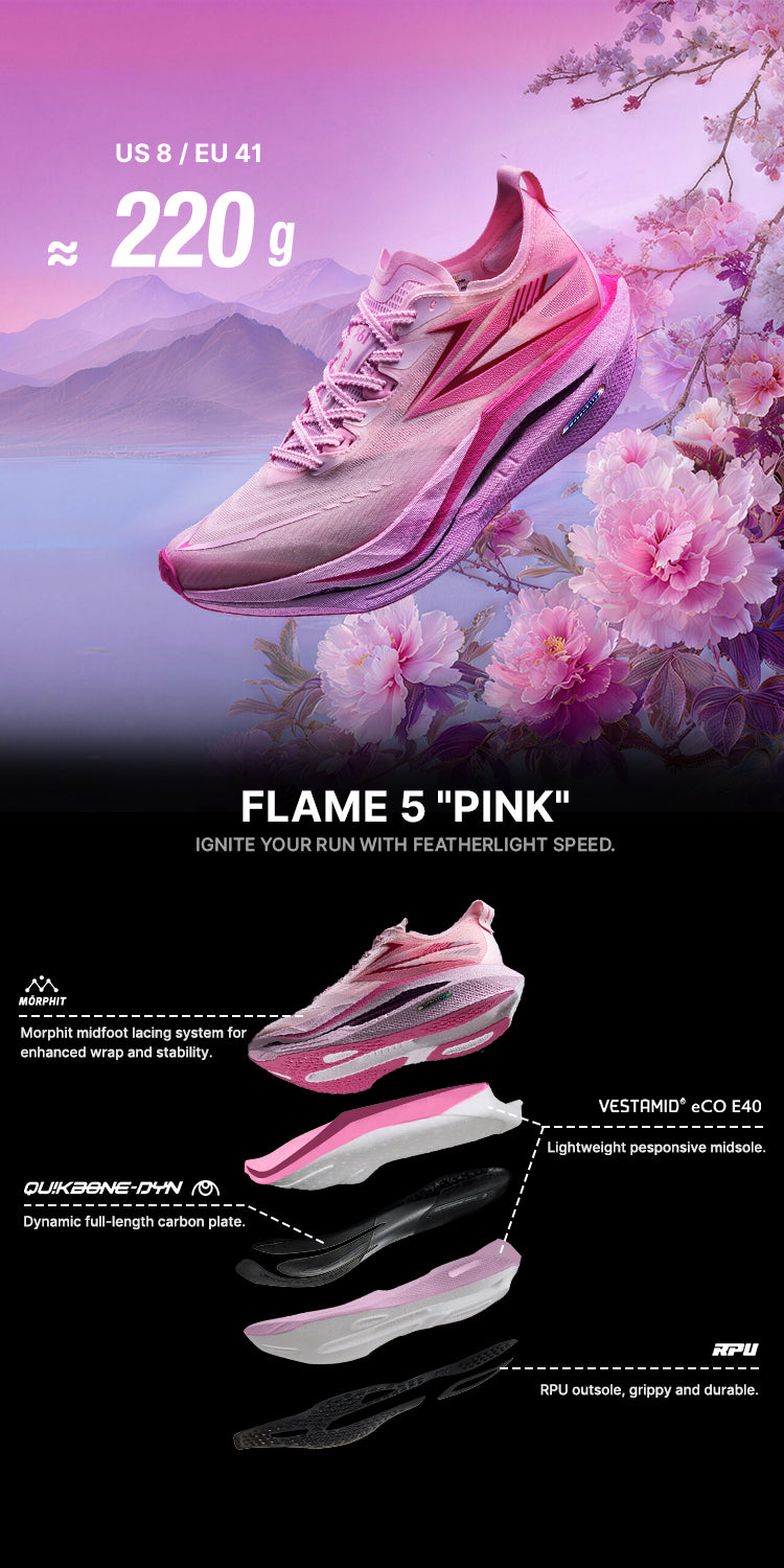 Full-length curved carbon plate with winged design and widened midfoot platform ensures smooth transitions, lateral stability, and effortless propulsion.