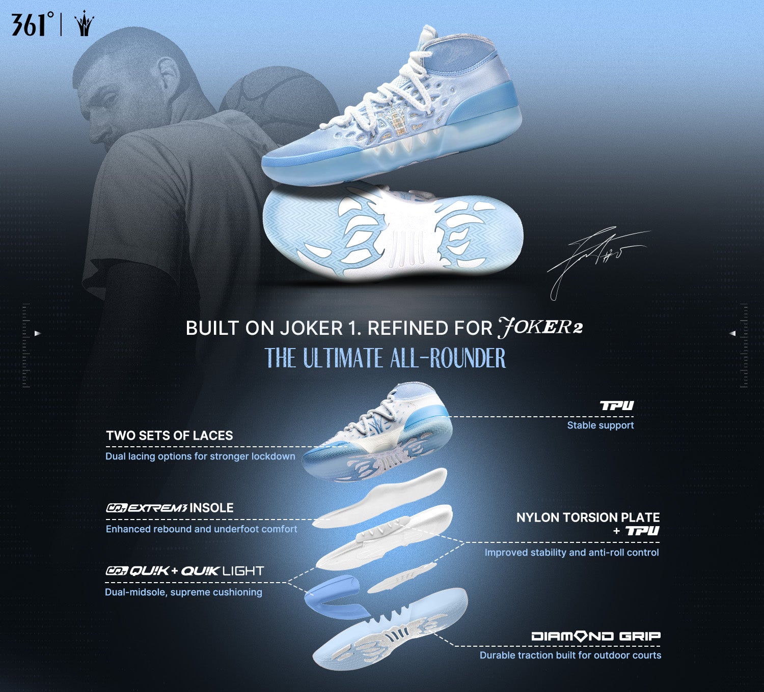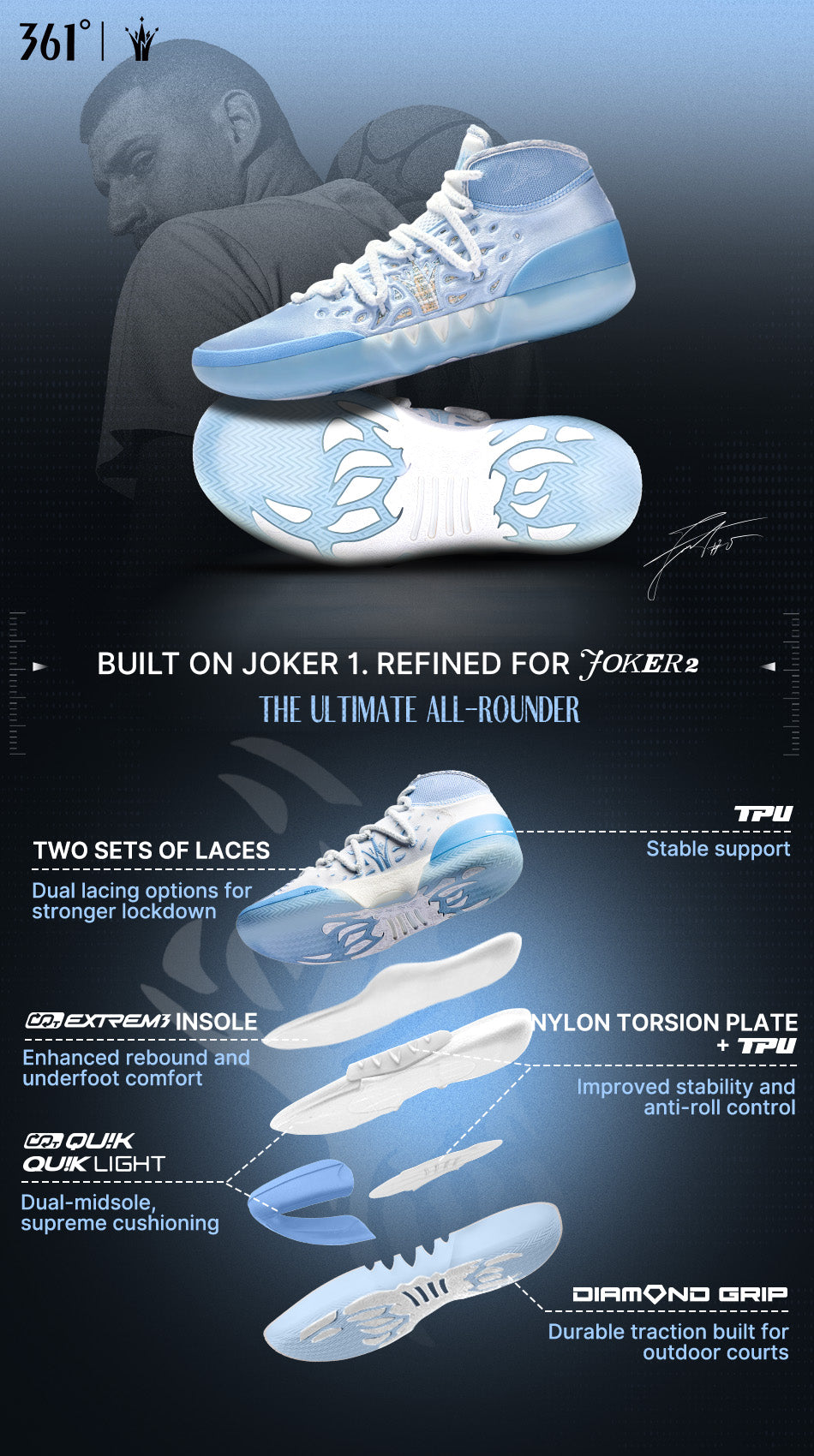 The CQT QUIK + QUIK LIGHT dual-midsole system absorbs impact instantly upon landing, delivering lightweight cushioning and immediate rebound for responsive take-offs and sharp acceleration.