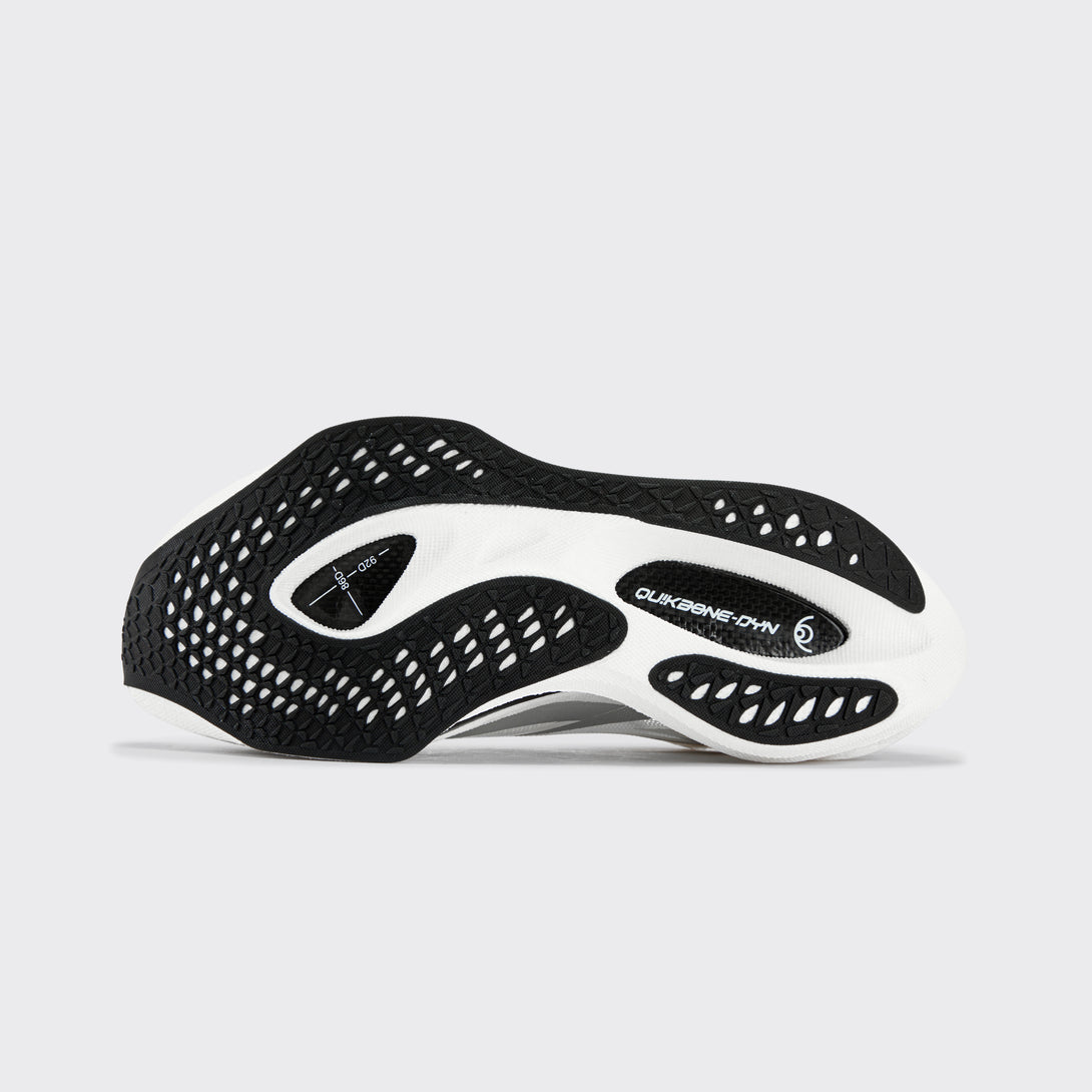 Qu!kBONE DYNAM!C carbon-fiber plate drives rolling propulsion, with arc forefoot for fit, lifted midfoot for support, and curved heel for shock absorption.