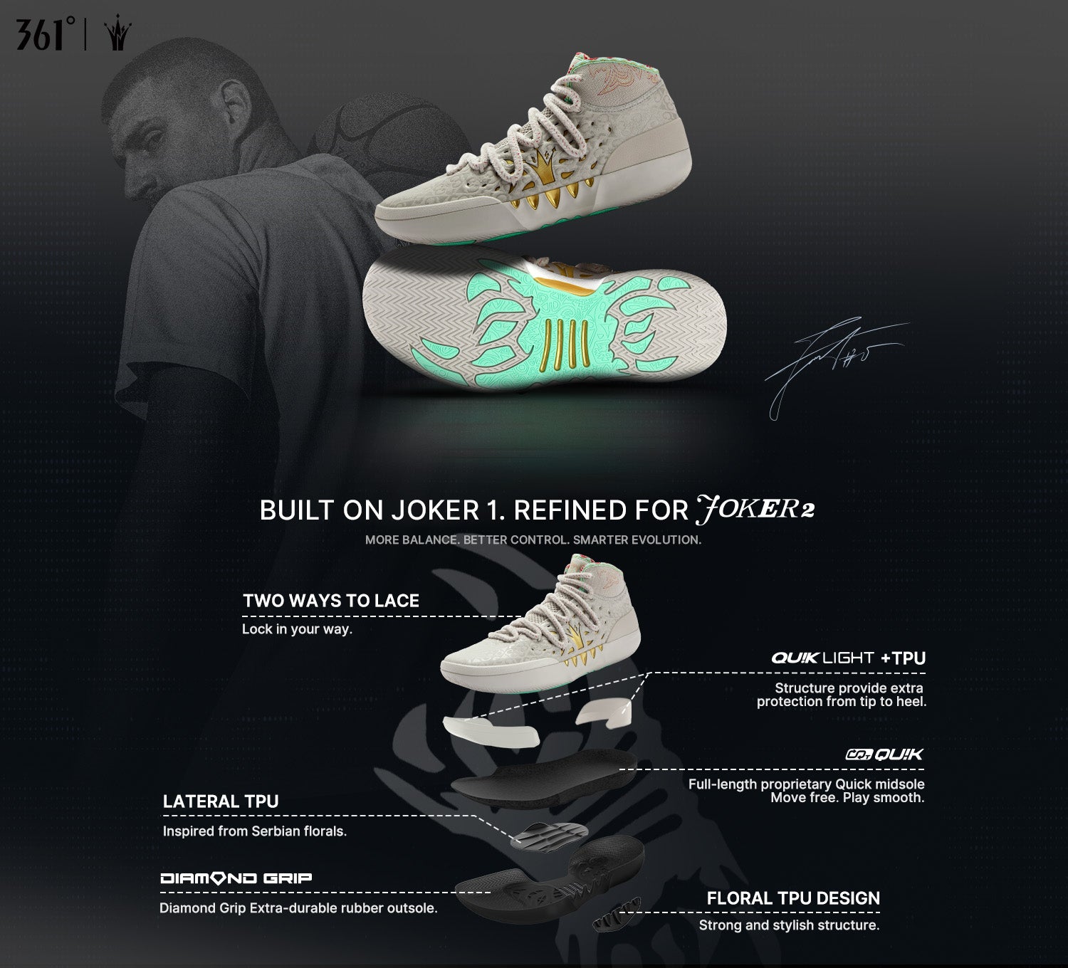 Featuring diamond grip rubber with Serbian-inspired texture for superior traction.Built-in anti-torsion plate prevents arch over-twisting. The side features Serbian-inspired floral TPU, combining style and function to boost lateral support and reduce rollover risk.