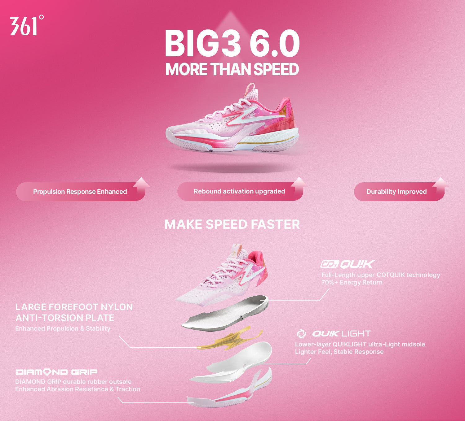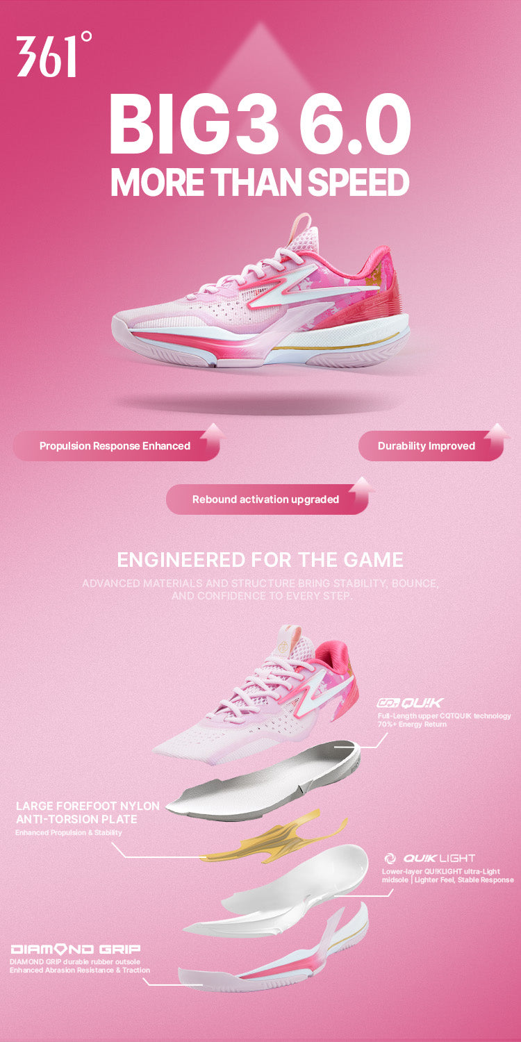 The drive plate, consisting of Qu!kCQTECH midsole (upper layer), fork-shaped nylon anti-torsion piece(middle layer), and QU!KFOAM LIGHT foam (bottom layer), provides more powerful propulsion.