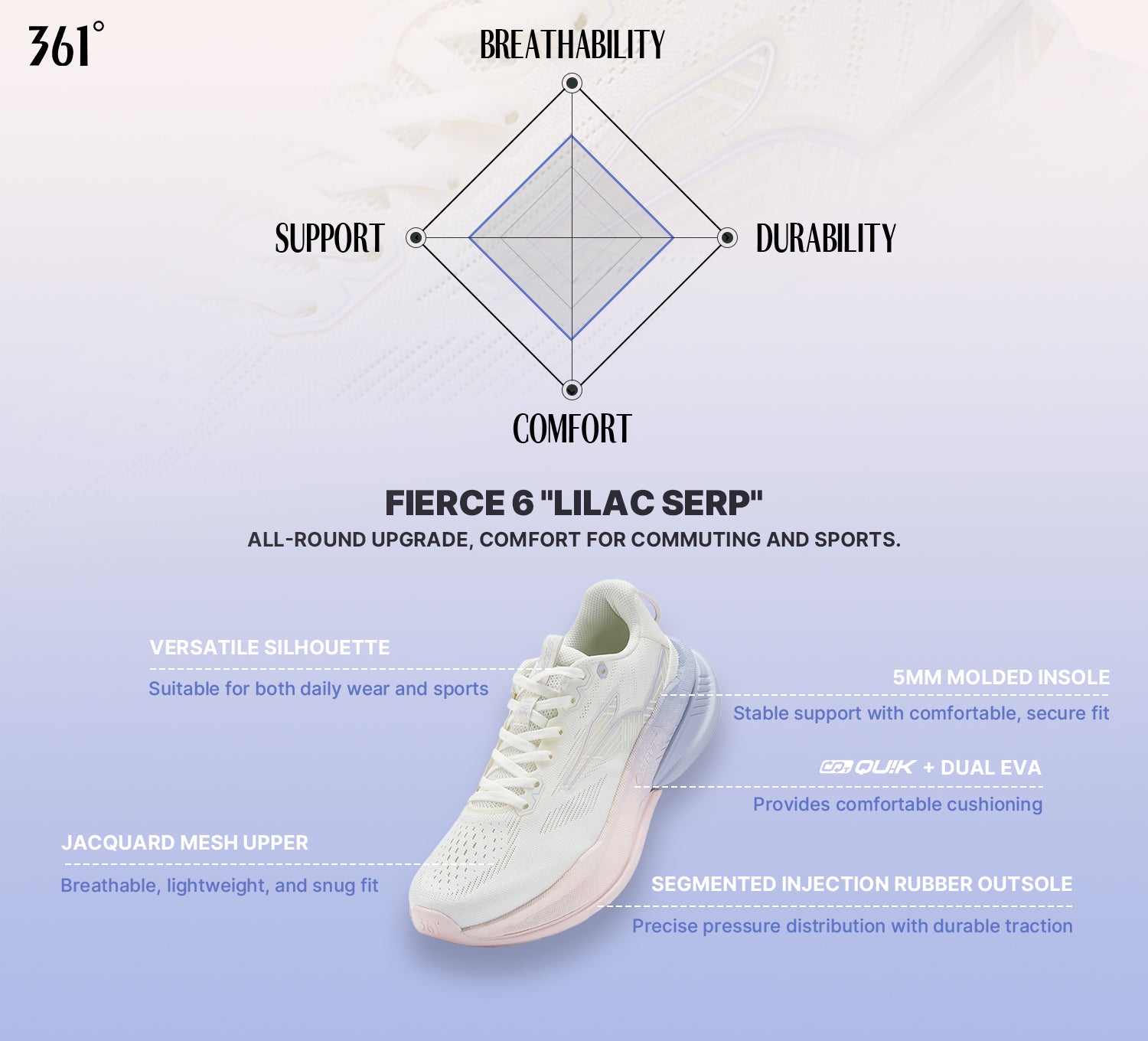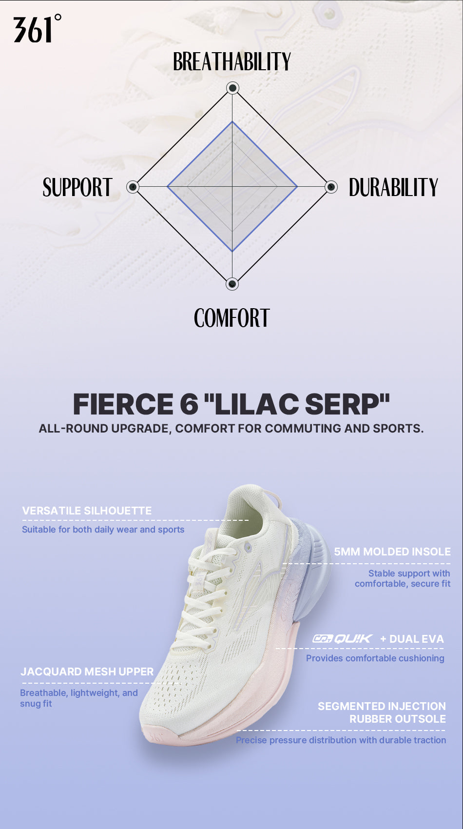 The CQT QU!K top layer delivers high rebound, while dual EVA beneath provides stable support for fatigue-free long walks. A molded insole supports the arch, and medial EVA helps prevent overpronation. Durable outsole ensures reliable grip, and the jacquard upper stays breathable—comfortable for both commuting and exercise.