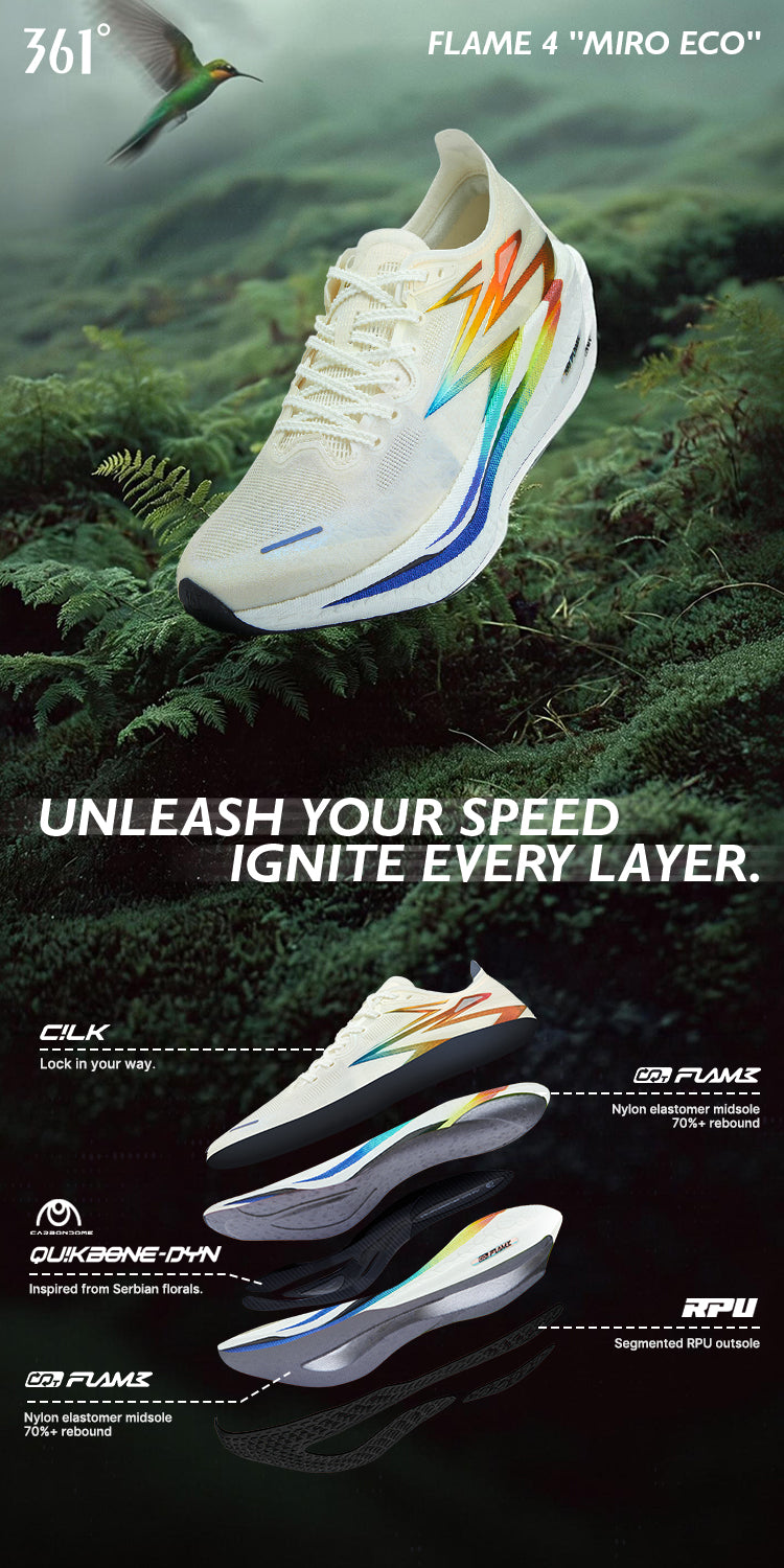 Double-layer Qu!kFLAMECQT (FLAMECQT) midsole for lighter weight, more springiness, and better cushioning, effectively saving energy for long-distance running activities.