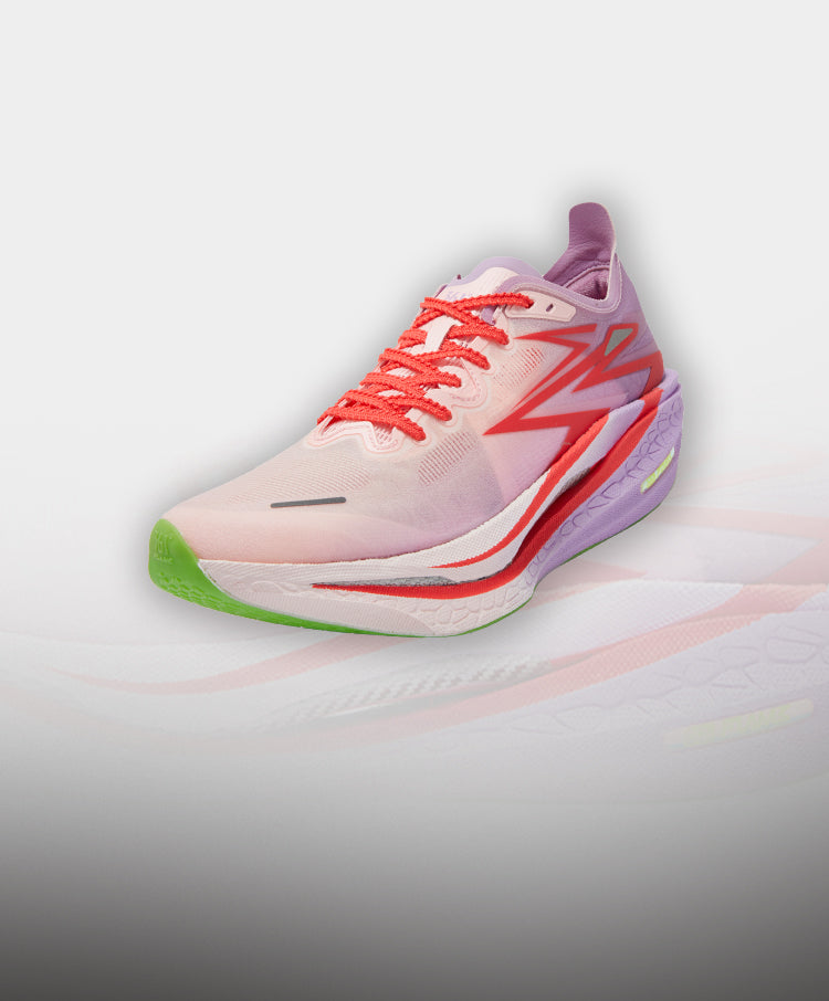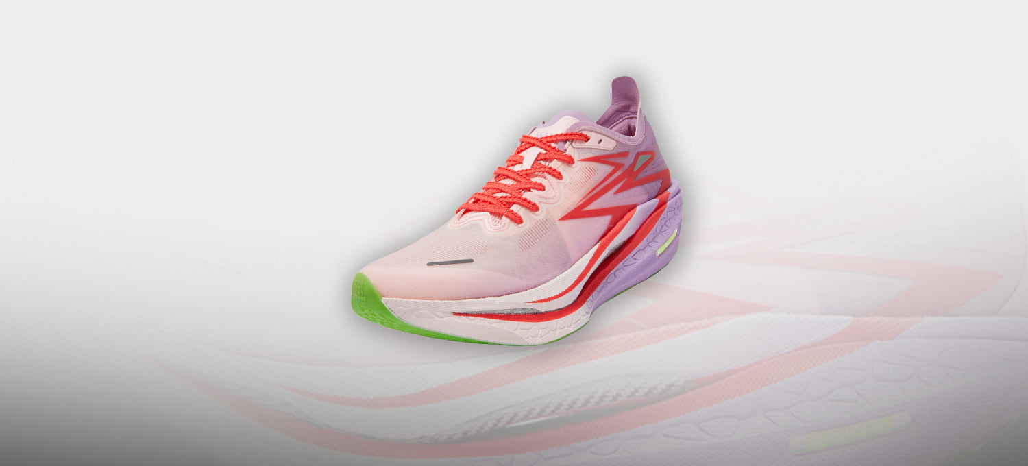 Double-layer Qu!kFLAMECQT (FLAMECQT) midsole for lighter weight, more springiness, and better cushioning, effectively saving energy for long-distance running activities.