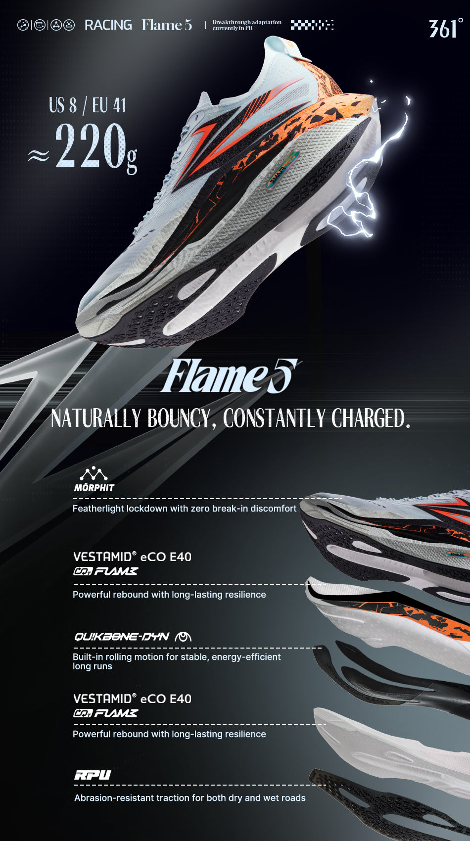Powered by CQT FLAME and upgraded eCO E40 nylon material, with hardness lowered to 40C, up to 85% energy feedback, and 80% rebound rate—delivering soft comfort, strong responsiveness, and durable performance that resists compression over time.