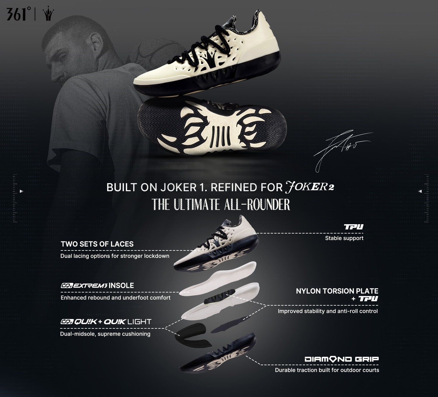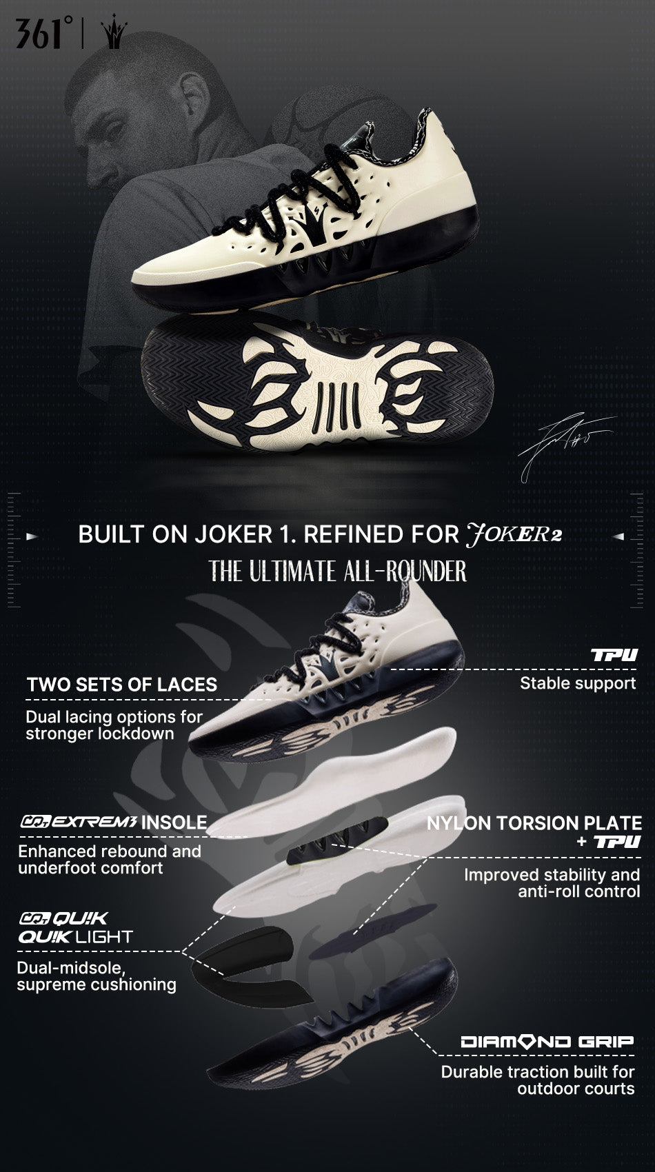 The CQT QUIK + QUIK LIGHT dual-midsole system absorbs impact instantly upon landing, delivering lightweight cushioning and immediate rebound for responsive take-offs and sharp acceleration.