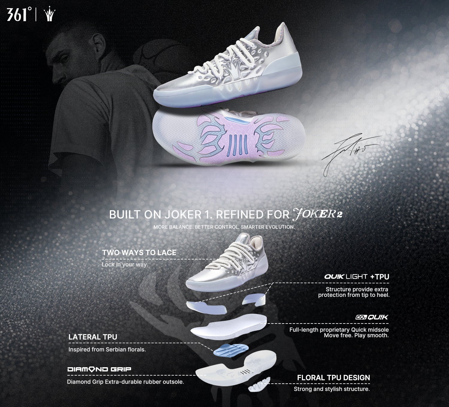 Featuring diamond grip rubber with Serbian-inspired texture for superior traction. Built-in anti-torsion plate prevents arch over-twisting. The side features Serbian-inspired floral TPU, combining style and function to boost lateral support and reduce rollover risk.