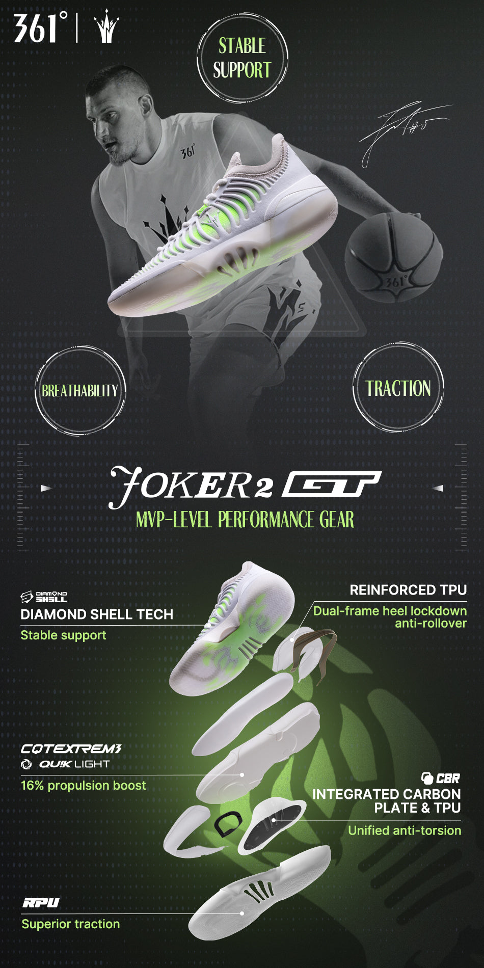 Built with a one-piece fusion of QU!KBONE carbon plate and TPU through an integrated molding process, excess adhesive is eliminated to achieve structural lightweighting. The design delivers strong anti-roll protection, arch support, and torsional rigidity, effectively limiting excessive deformation during high-intensity cuts and direction changes for precise, controlled power return.
