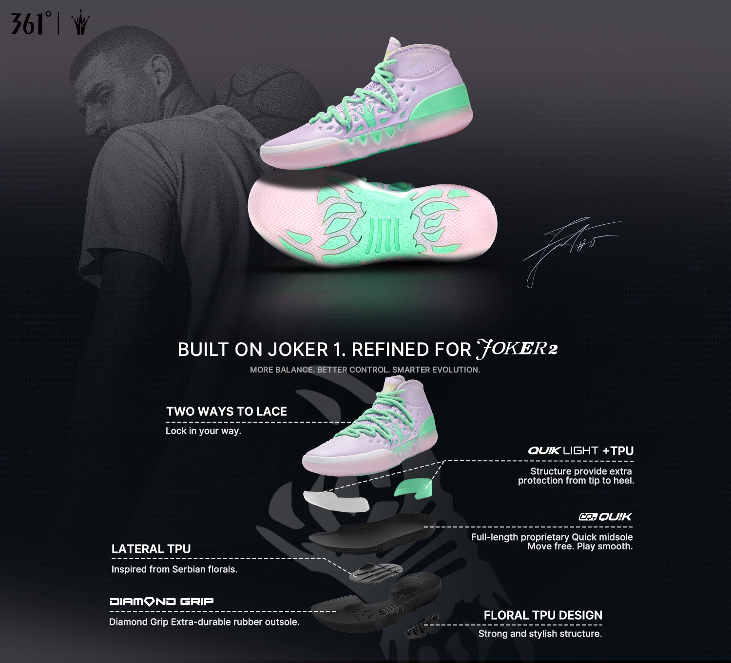 The shoe sports Jokić’s personal logo for a signature touch, while the floral TPU detail on the side pays tribute to his Serbian roots.
